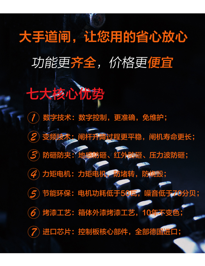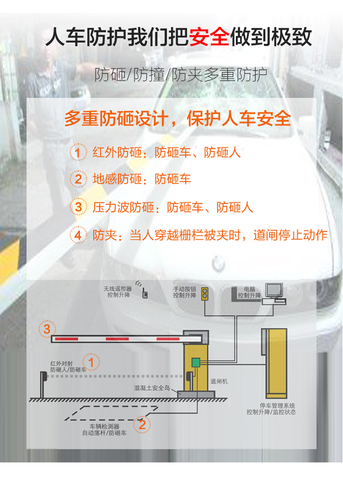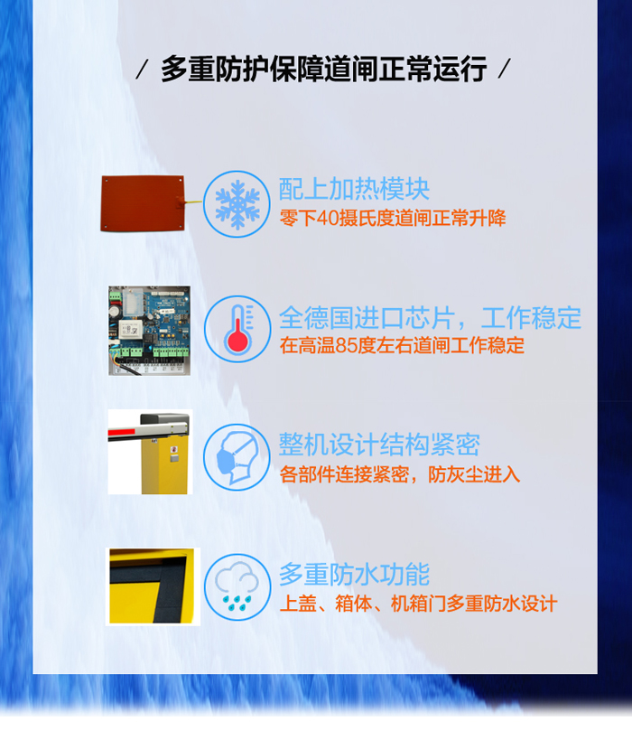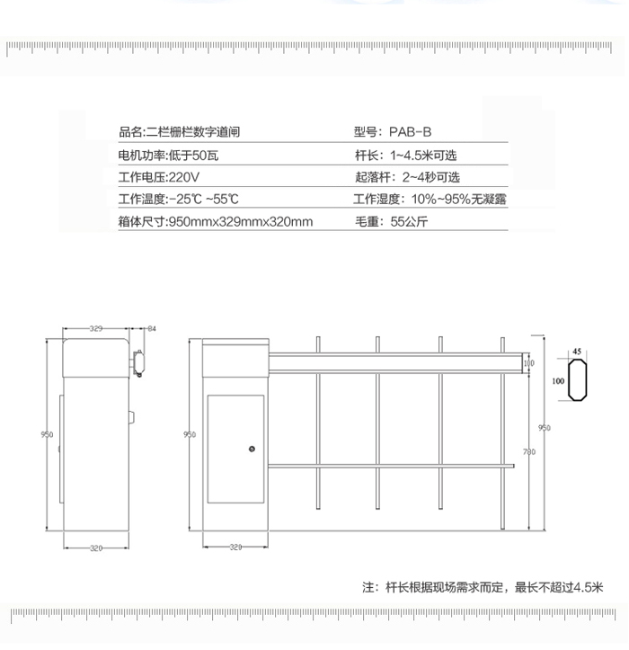 二欄柵欄數(shù)字道閘-B型,在直桿道閘的基礎(chǔ)上再加上一根橫欄,整體由道閘箱體和二欄柵欄組成。桿長(zhǎng)最多4.5米,閘機(jī)升降速度在1秒、1.5秒、2秒、3秒、4秒之間可選。二欄柵欄同時(shí)具備兩大優(yōu)勢(shì):1、外形美觀大方;2、防止人員直接從閘桿下方鉆進(jìn)鉆出。富有人性化設(shè)計(jì)的二欄柵欄數(shù)字道閘,可以有效防止閘桿抖動(dòng),避免意外事件發(fā)生。道閘與大手各類停車系統(tǒng)都能完美匹配,是停車管理系統(tǒng)的得力助手。